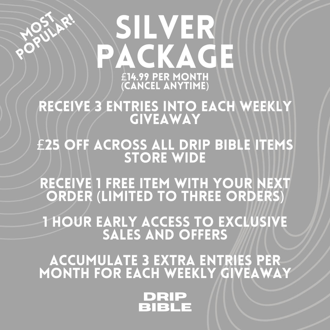 Your Silver Package subscription has been successfully activated. ✅Here’s what happens next:1️⃣ Entries Added: Your 3 entries have been added to our weekly prize wheel.2️⃣ Weekly Draws: The wheel is spun every Thursday at 10am to determine and announce our lucky winners on our Instagram and via our email list.3️⃣ Exclusive Perks: You now have access to all the benefits of your DB+ package, including:£25 off all future orders using code 'SILVER25'1 FREE item with your next Drip Bible order (limited to three orders).1-hour early access to exclusive sales and offers.Accumulate 3 extra entries per month for each weekly giveaway.🏆 What You Can Win:Premium clothing, shoes, accessories, and more from your favorite brands!📩 Check Your Inbox: Keep an eye on your email for updates, announcements, and winner notifications.Need assistance? Our team is here to help!📧 Email us at [email protected] or via Instagram @dripbible_Good luck, and welcome to the DB+ family!