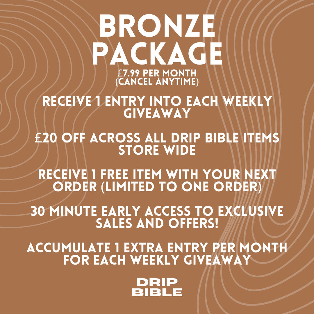 Your Bronze Package subscription has been successfully activated. ✅Here’s what happens next:1️⃣ Entries Added: Your one entry has been added to our weekly prize wheel.2️⃣ Weekly Draws: The wheel is spun every Thursday at 10am to determine and announce our lucky winners on our Instagram and via our email list.3️⃣ Exclusive Perks: You now have access to all the benefits of your DB+ package, including:£20 off all future orders using code 'BRONZE'1 FREE item with your next Drip Bible order (limited to one order).30-minute early access to exclusive sales and offers.Accumulate 1 extra entry per month for each weekly giveaway.🏆 What You Can Win:Premium clothing, shoes, accessories, and more from your favorite brands!📩 Check Your Inbox: Keep an eye on your email for updates, announcements, and winner notifications.Need assistance? Our team is here to help!📧 Email us at [email protected] or via Instagram @dripbible_Good luck, and welcome to the DB+ family!
