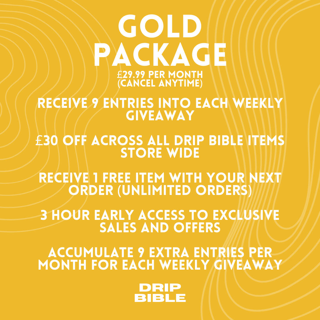 Your Gold Package subscription has been successfully activated. ✅Here’s what happens next:1️⃣ Entries Added: Your 9 entries have been added to our weekly prize wheel.2️⃣ Weekly Draws: The wheel is spun every Thursday at 10am to determine and announce our lucky winners on our Instagram and via our email list.3️⃣ Exclusive Perks: You now have access to all the benefits of your DB+ package, including:£30 off all future orders using code 'GOLDPACKAGE30'1 FREE item with all life time orders from Drip Bible.3-hour early access to exclusive sales and offers.Accumulate 9 extra entries per month for each weekly giveaway.🏆 What You Can Win:Premium clothing, shoes, accessories, and more from your favorite brands!📩 Check Your Inbox: Keep an eye on your email for updates, announcements, and winner notifications.Need assistance? Our team is here to help!📧 Email us at [email protected] or via Instagram @dripbible_Good luck, and welcome to the DB+ family!